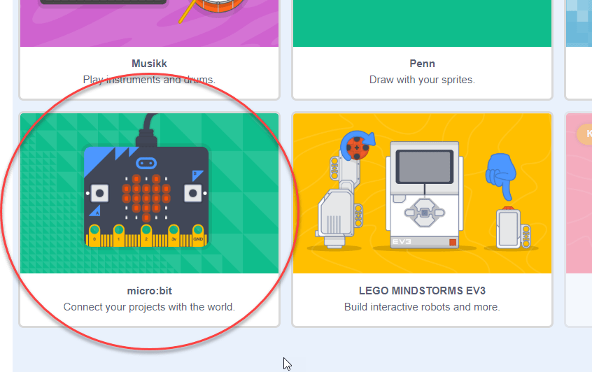 Velg tillegget for Micro:bit for å legge til blokker som er spesifikke for Micro:bit samt starte prosessen med å koble opp Micro:bit til Scratch.