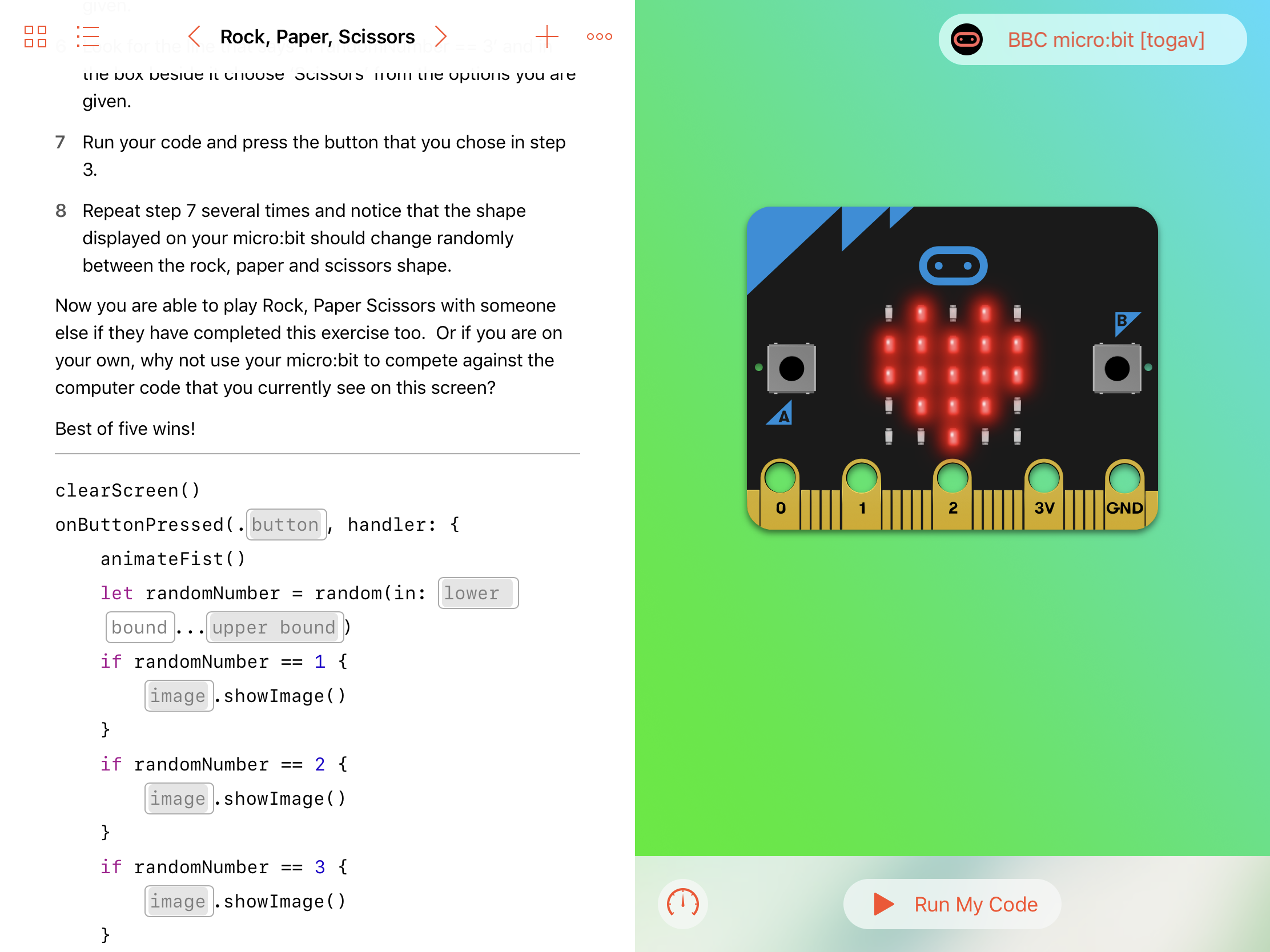 - For å koble sammen Micro:bit og Swift Playground åpner du «boken». I leksjon 2 «Display Text» velger du «Pair Micro:bit» og følger oppskriften der.