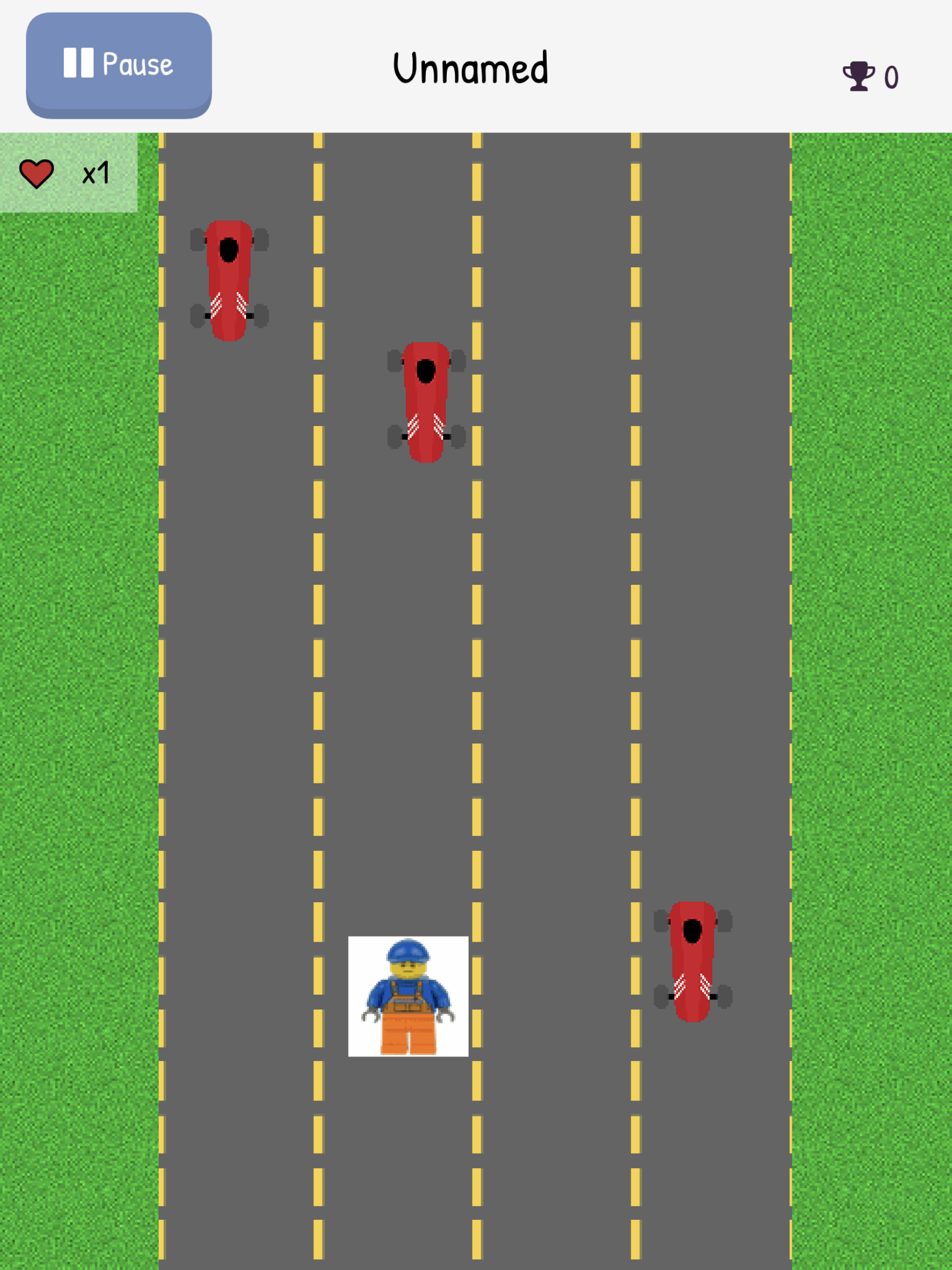 En kan lage bakgrunner, hinder og hovedpersoner selv i tegnemodus eller en kan bruke clipart, egne bilder eller ta bilder med kameraet selv. En kan med andre ord sette personlig preg på spillene en lager. I bildet under ser du et enkelt spill jeg laget, med en Lego figur som skal unngå racerbiler.
