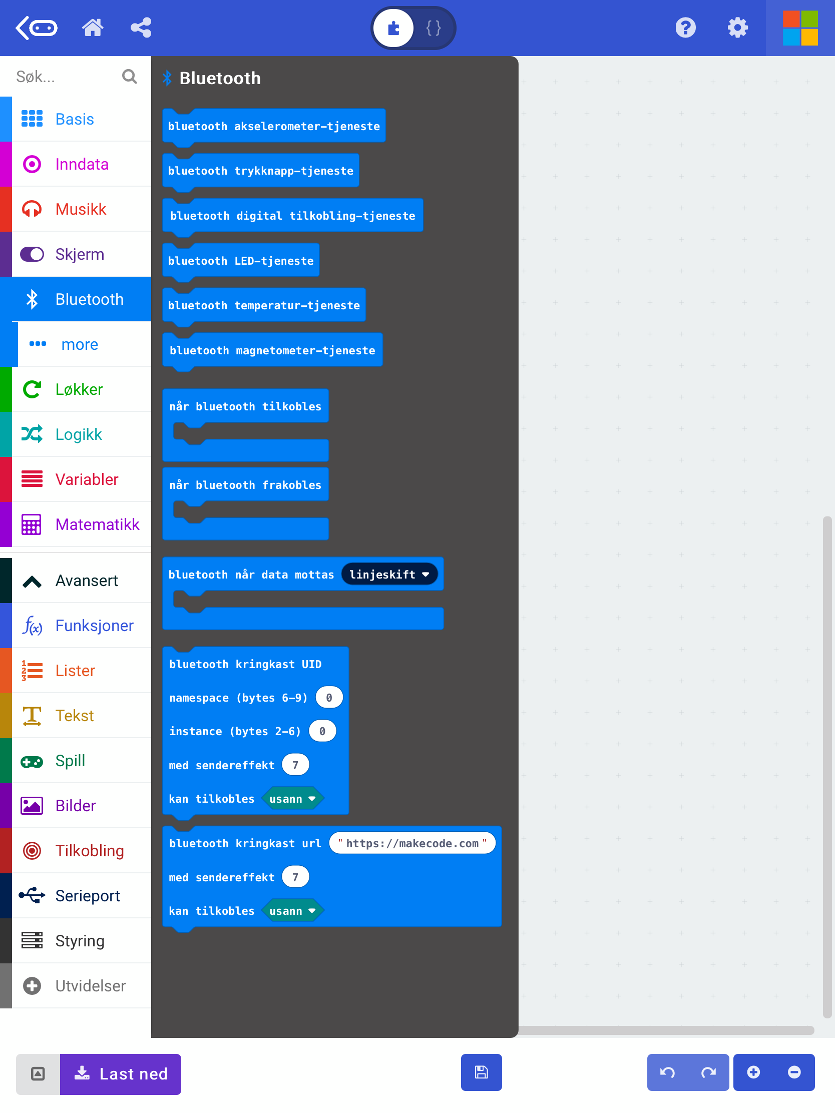 For at dette skal virke må en installere et tillegg for bluetooth kommunikasjon. Dette finnes under Utvidelser/Extensions og heter rett og slett Bluetooth. For at dette skal fungere, må MakeCode fjerne utvidelsen for radio-kommunikasjon.