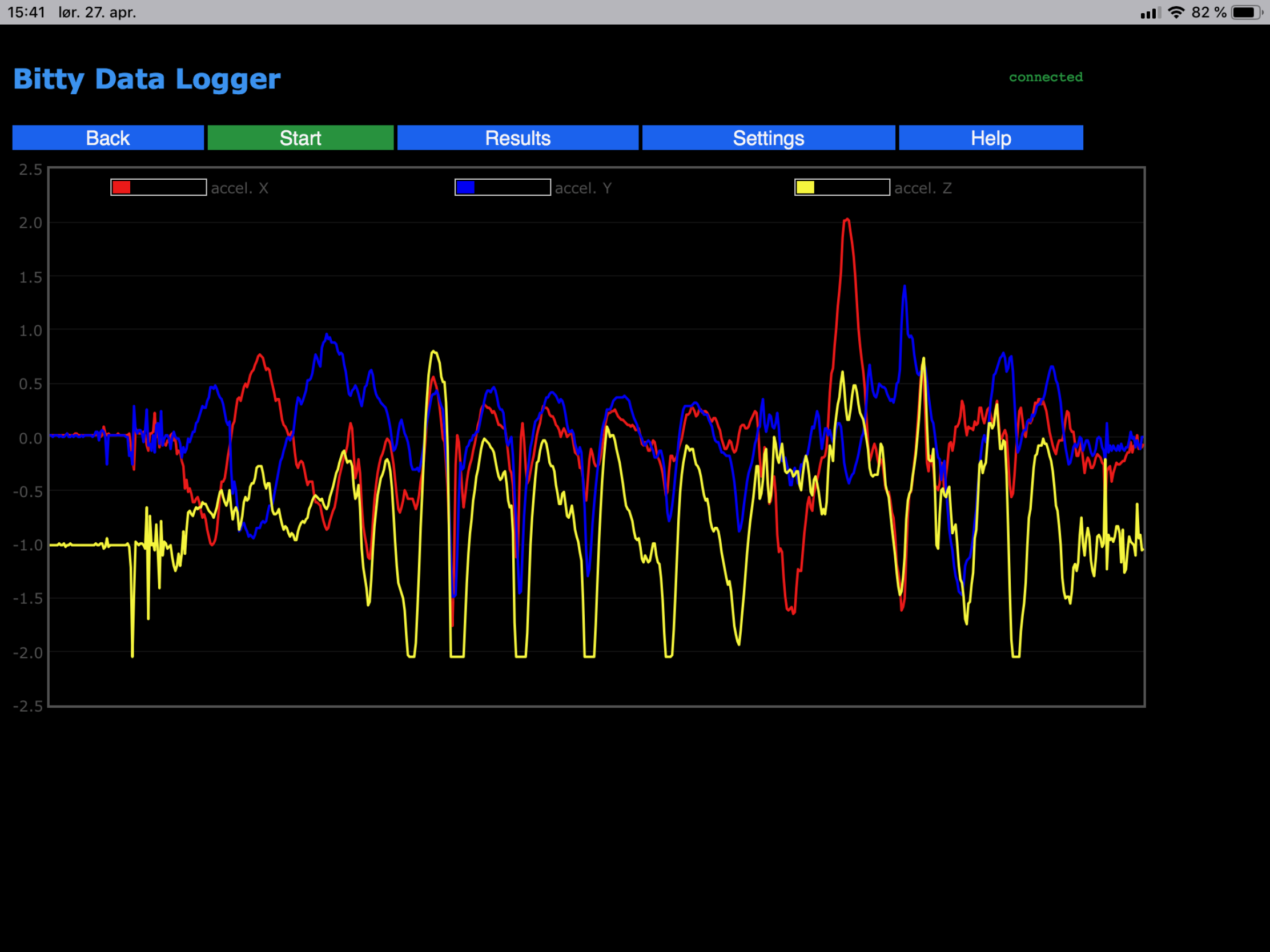 Etter å ha valgt micro:bit kommer du inn i logg-delen av appen. Under «Settings» velger du hvilke sensorer, hvilke data og avlesningshyppighet du ønsker for prosjektet. Velg «Start» for å starte loggingen. Når du starter får du opp live data fra loggingen.