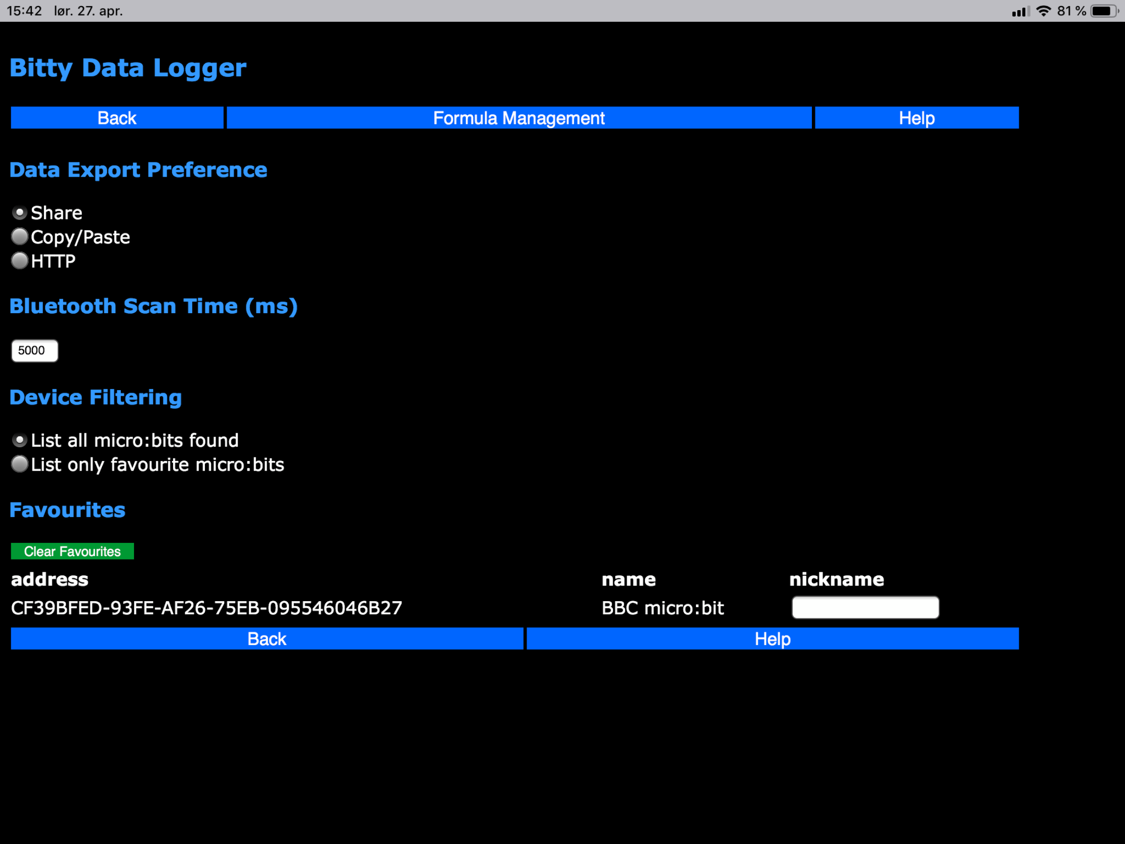 Hvordan fungerer den så? Ved oppstart velger du under «Scan» den micro:bit du ønsker å logge data fra. Under «Options» kan du velge eksport, og jeg fant ut at «Share» kanskje var den enkleste.