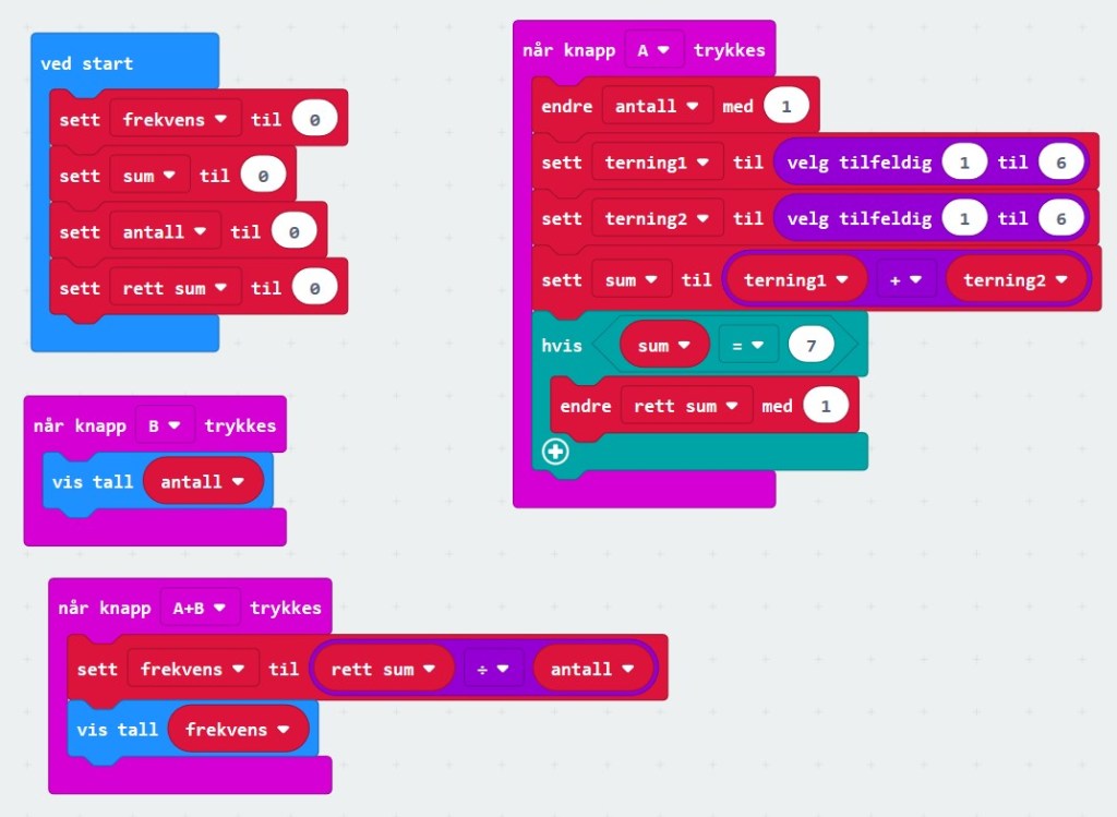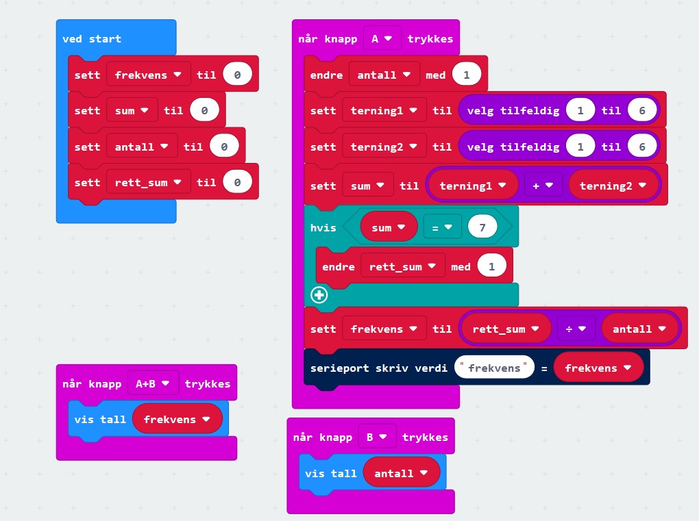 Vi skal nå lage et program for micro:bit som finner frekvenstallet for hvor ofte vi får f.eks sum lik 7 (dette kan og bør forandres) når vi triller 2 terninger. Programmet kaster 2 terninger hver gang vi trykker på A-knappen. Verdien lagres i to ulike variabler som summeres.