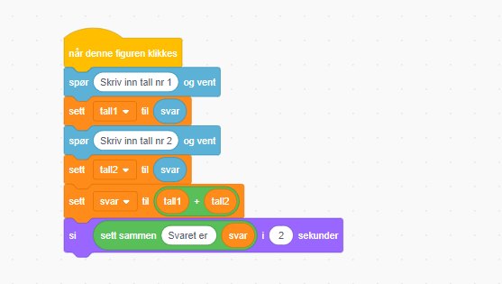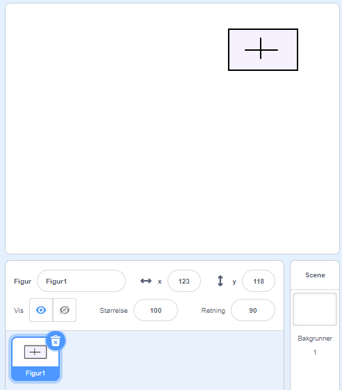 Begynn med å fjerne katten og legg til et nytt ikon du tegner selv. Vi begynner med «pluss» og begynner deretter å legge inn kode på denne. Når «pluss» er ferdig kan vi «kopiere» koden med oss til de andre regneartene.