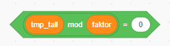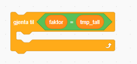 Vi skal nå foreta tester for å finne faktorene som tallet er bygd opp av. Vi lager en løkke som vi kjører til faktoren og tmp_tallet blir likt. Da er det ikke vits å teste lenger, siden vi har kommet til et primtall.