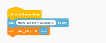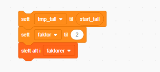 Svaret, altså heltallet, setter vi i variabelen start_tall som vi tar vare på til bruk senere. Det samme tallet, skal vi bearbeide underveis, så vi flytter det over i en midlertidig variabel tmp_tall og samtidig så setter vi den første faktoren vi skal undersøke til 2. Å teste for 1 har ingen funksjon.