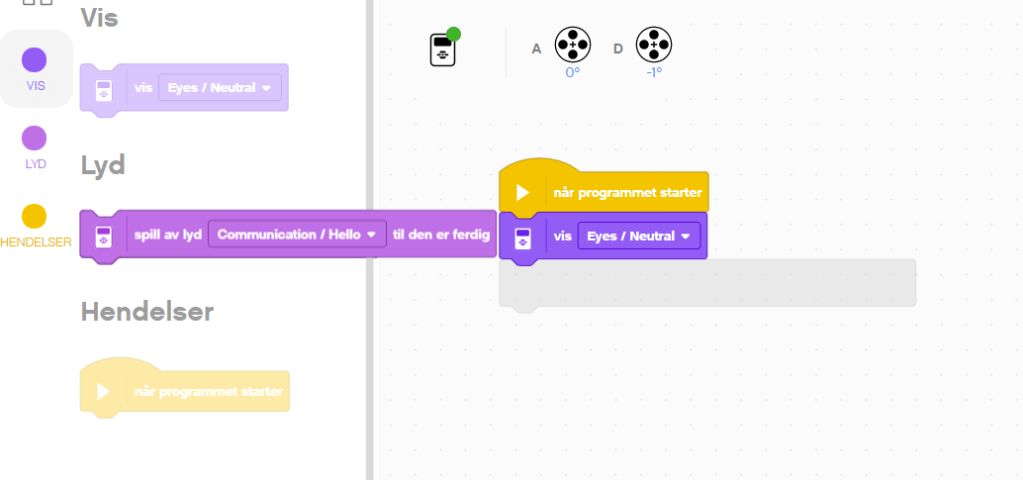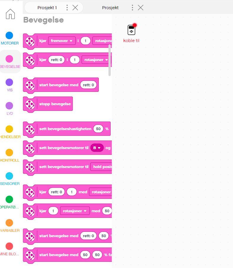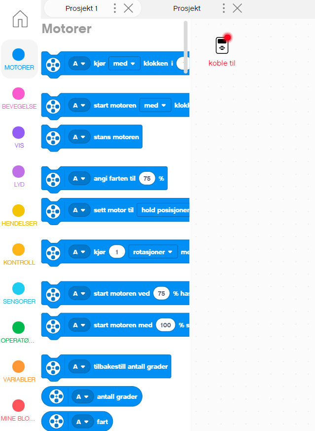 Som for Lego Spike har man valgt å benytte å Scratch-blokker. Dette ser ut til å bli standarden for Lego framover. I Classroom erstattes ikonene som ble brukt i det originale Labview-programmet, med blokker. Og for elever som er vant til Scratch-blokker og Scratch grensesnittet er det stor gjenkjennelsesfaktor og overføringsverdi. Blokkene er sortert i kategorier som er likt det vi finner i både Scratch og Spike.