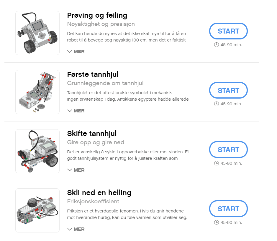 Enkelt og selvgående. Prosjekt 1 tar for seg EV3 huben, prosjekt 2 de ulike motorene og sensorene, mens prosjekt 3 tar for seg en standard kjørebase.