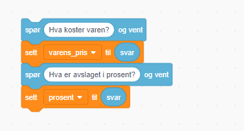 Programmet skal spørre etter prisen før avslaget. Denne lagres i en variabel. Deretter skal den spørre etter avslaget i prosent, og lagre det i en annen variabel.