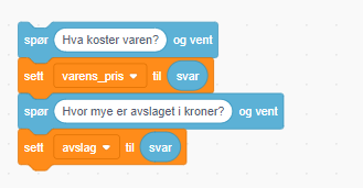 Det nye programmet skal spørre etter prisen og avslaget, og lagre dette i variablene.