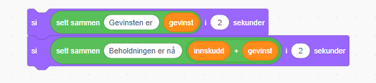 Vi presenterer resultatet for brukeren. Både gevinsten og hvor mye det nye innskuddet er.