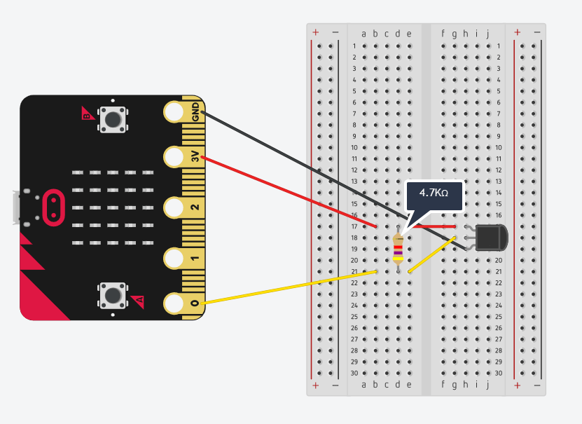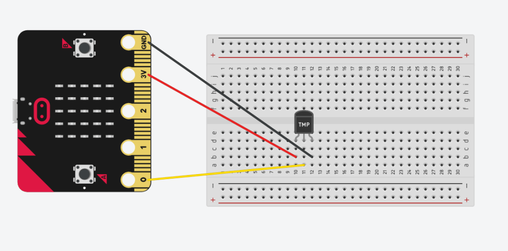 TMP36 er en temperatursensor som enkelt kan kobles til en microbit og gi en mer nøyaktig temperatur enn den interne temperatursensoren. TMP36 finnes i flere varianter, der noen kan kobles direkte til microbiten ved hjelp av krokodillekabler, mens andre gjerne må kobles via et koblingsbrett som vist under.