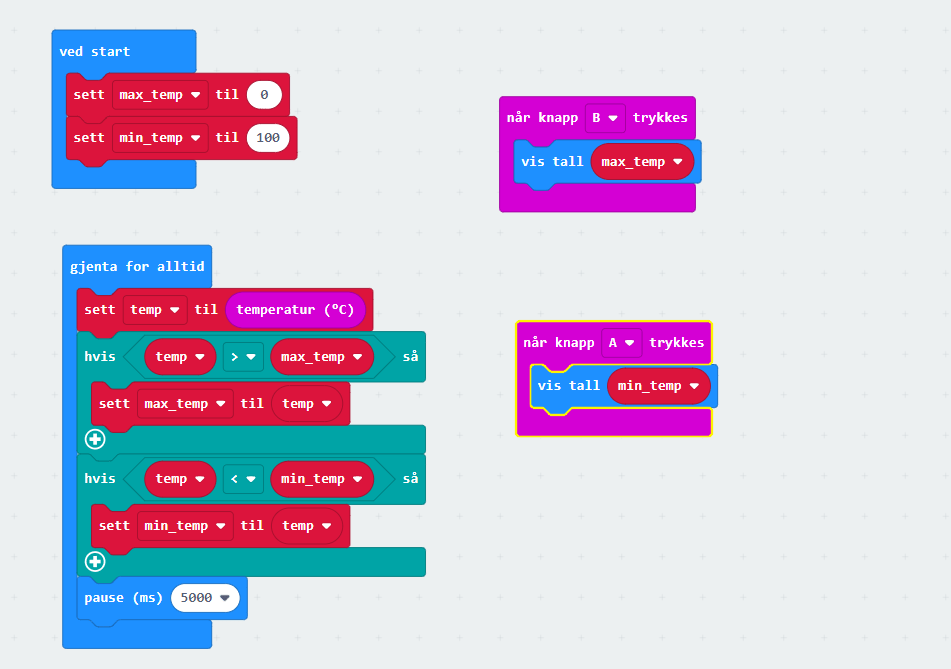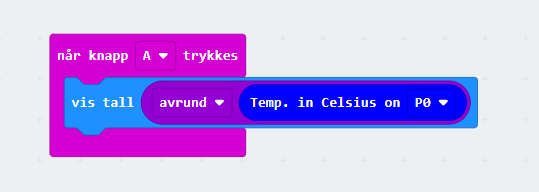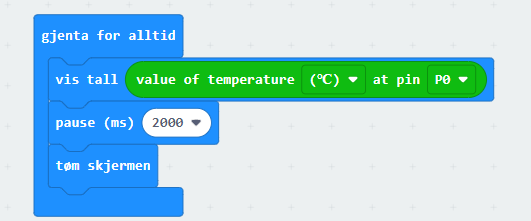 Den som kanskje er enklest å ta i bruk er temperatursensoren som ligger tilgjengelig på microbiten. Data fra denne sensoren kan vises enkelt ved hjelp av en egen temperatur-blokk, men en vil kanskje raskt oppdage at denne ikke er nøyaktig. Den er plassert for nærmere prosessoren på microbiten, og får en del varme fra denne.
