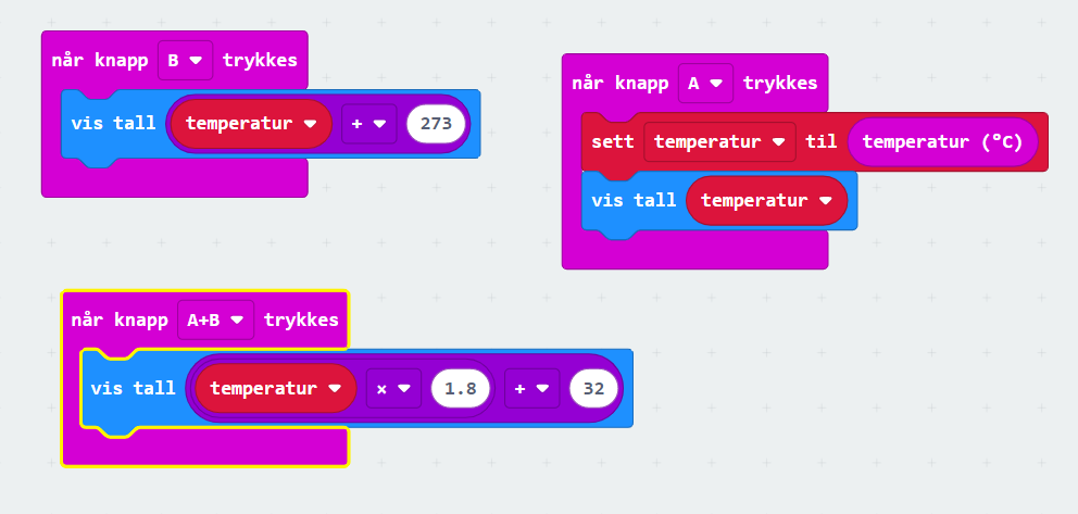 Det finnes flere måter å kode denne på, og jeg presenterer her en enkel og en litt mer komplisert. Den enkle bruker blokker fra Elecfreaks sitt SmartHome sett, som gjør utregningen for deg. Legg til SmartHome utvidelsen, og bruk temperaturblokken derfra.