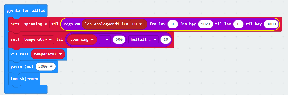 En kort forklaring av koden: i første linje konverteres verdien som kommer fra sensoren til mV og lagres i variabelen spenning. Verdien som kommer er mellom 0 og 1023 og dette regnes om til en verdi mellom 0 og 3000. NB! Verdien her varierer veldig. Jeg har funnet alt fra 2700 til 3300 mv. Har brukt 3000, da denne gir likt resultat som koden over. I andre linje fjernes 500 mv som er spenningen sensoren bruker og deretter dele på 10 for å få temperaturen i Celsius.