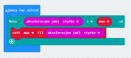 Microbiten skal foreta max målinger av akselerasjonen. Målingen skal foregå kontinuerlig fra microbiten starter, vi legger derfor koden under gjenta for alltid blokken. For hver gjentakelse av testen skal den sjekke mot tidligere max målinger. Er den høyere skal den oppdatere max målingen.