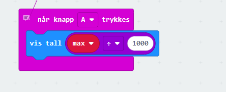 Når vi trykker på A-knappen skal den presentere max-verdien for brukeren. Verdien er registrert i milli-g, altså må vi dividere på 1000 for å få fram g-kreftene.