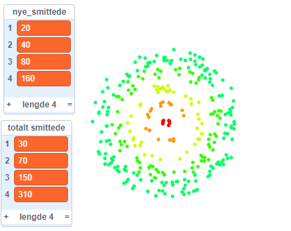 Ofte blir en slik oppgave mye stiligere og mer effektfull om vi visualiserer resultatet. Dette kan gjøres på mange måter. En kan klone en figur for hver smittede, en kan tegne en prikk for hver smittede, et tre som utvider osv. I dette opplegget kommer jeg til å vise to ulike varianter av en visualisering hvor jeg tegner en prikk for hver smittede.