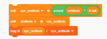 Vi har egentlig alt vi trenger for å beregne hvordan smitten utvikler seg. Vi lager en løkke, som skal kjøres like mange ganger som vi har ledd smitten skal gå. Samtidig må vi tenke gjennom hvilke data vi ønsker å hente ut. Vi skal sette antall nye smittede inn i en liste som vi kaller nye smittede og totalt antall smittede i en annen liste vi kaller totalt smittede.