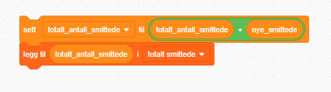 Deretter er det på tid å summere opp totalt antall smittede, og det er jo tidligere registrert antall smittede + de nye smittede.