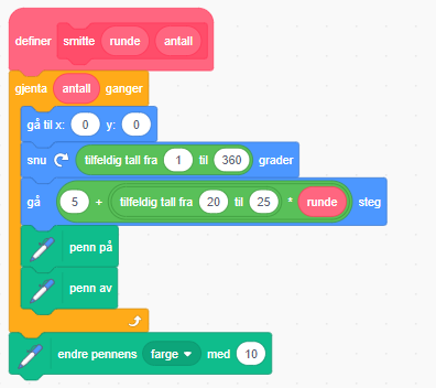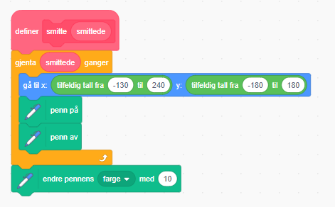 Det første eksempelet skal lage en tilfeldig prikk for hvert smittetilfelle. For hvert ledd skal den endre farge, slik at en ser forskjellen på de ulike leddene. For å gjøre det lettere å programmere lager jeg en funksjon som jeg kaller hver gang jeg skal inn på et nytt ledd i smitten. Jeg kaller det smitte, og jeg sender med antall smittede i dette leddet.