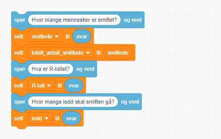 Vi lagrer svarene i variabler som vi navngir etter hva de spør etter. Legg merke til at jeg legger antall smittede inn i variabelen totalt antall smittede med en gang, slik at jeg ikke glemmer det senere.