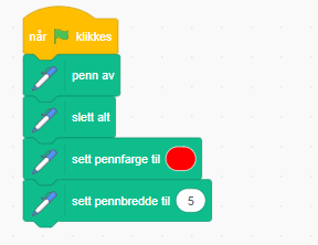 Jeg begynner med å legge til pennverktøyet for å få tilgang til tegneblokkene. Jeg lager en ny startsekvens som tømmer skjermen og gjør klar pennen. Denne brukes for begge eksemplene.