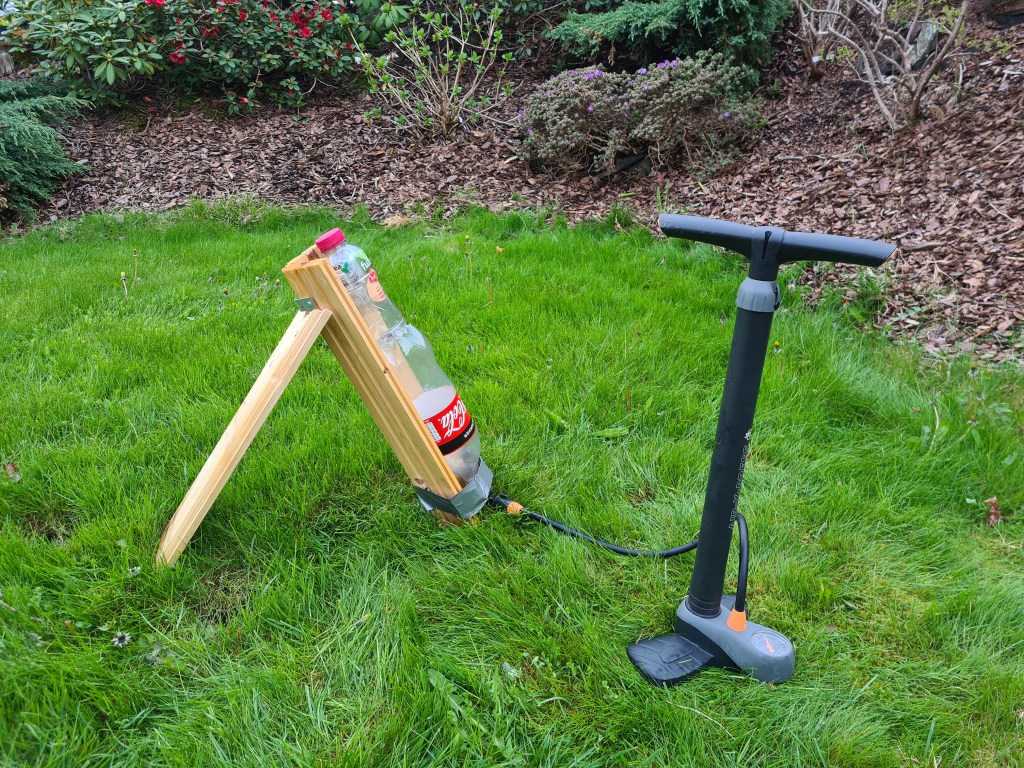 Fyll den store flasken opp med ca 0,5 liter vann, sett i korken og monter sykkelpumpen og sett alt i stativet, slik at du er klar til å fyre av raketten. Like før den tar av, trykker du inn A-knappen på microbit 2, slik at av loggingen av data begynner. Når trykket er stort nok letter raketten, og dataene blir registrert.