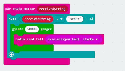 Her har jeg kun bedt om samlet g-kraft, og jeg ber om at den kjøres 50 000 ganger slik at jeg er sikker på den logger nok forekomster. Ønsker du ulike registreringer, f.eks x, y eller z-aksen legger du inn disse og skiller ved å sende en parameter som forteller hva det er du sender.