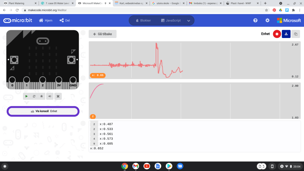 Disse sendes til den andre microbiten, som er koblet til PC ved USB kabel og logger data i konsollet ved hjelp av WEBUSB grensesnittet. Les mer om dette her og om datalogging her.