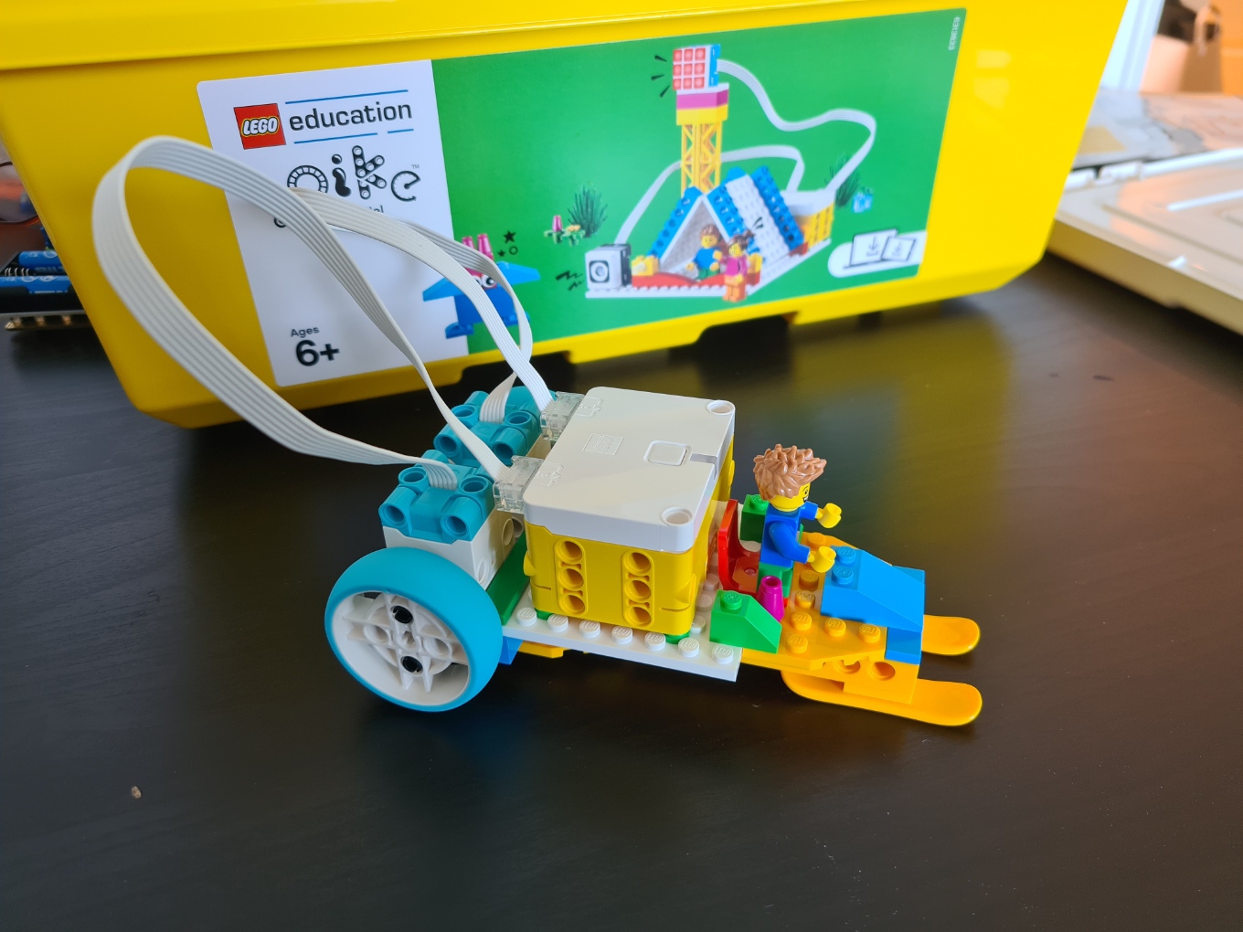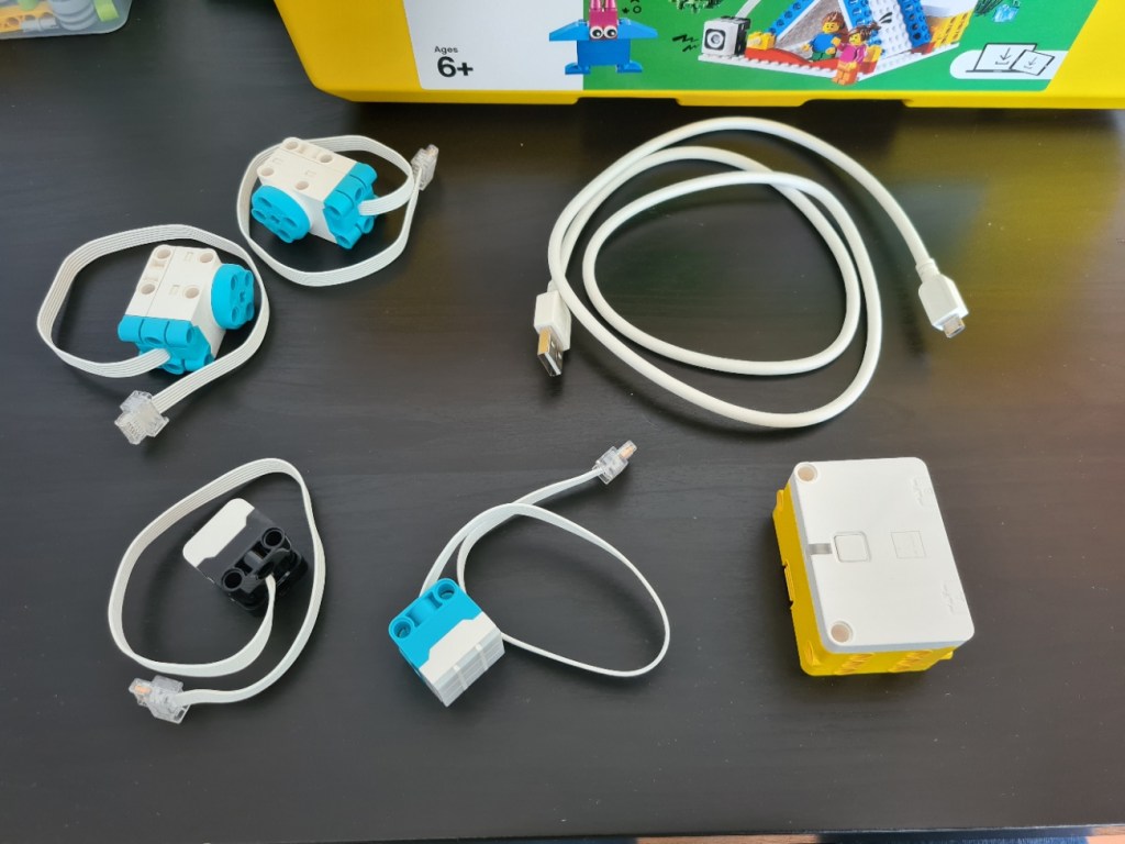 Likheten med Lego Spike Prime er veldig tydelig. Hjernen er gul og hvit, akkurat som storebroren, men den mangler LED-matrixen på toppen. I tillegg har den bare 2 tilkoblingsmuligheter, så problemet vi opplevde med Lego WeDo 2.0 er ikke løst. Huben har et eget batteri som lades via micro-usb, så dermed er det slutt på å bytte batterier.