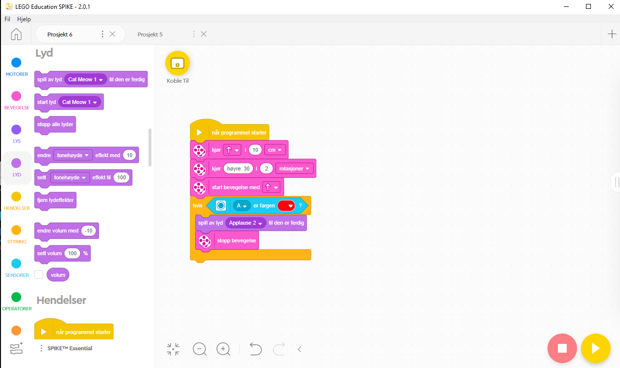 Programmeringen foregår i den samme appen som for Lego Spike Prime. Ved oppstart av appen velger en mellom Spike eller Essential, for så å bli geleidet inn i korrekt oppsett.