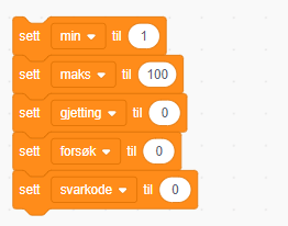 I dette programmet trengs en del variabler. Blant annet variabler for å justere min og maks verdier i intervallet den skal lete etter tall. Vi setter dem til intervallet vi har avtalt i begynnelsen.
