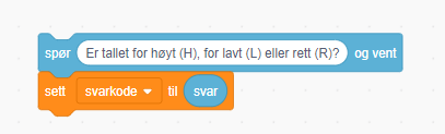 Brukeren vurderer svaret fra datamaskinen og svarer tilbake om det er for høyt (H), for lavt (L) eller korrekt. Svaret fra brukeren legges i en variabel for videre vurdering.