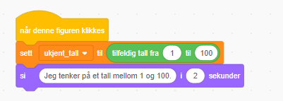 Programmet skal starte når figuren klikkes. Da skal det velge et tilfeldig tall mellom f.eks 1 og 100, og plassere i en variabel. Deretter informerer programmet brukeren.