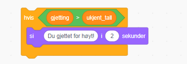 Da har vi begge tallene tilgjengelig, så det er på tide å vurdere tallene mot hverandre. Er brukerens svar høyere enn det ukjente tallet, så gis det beskjed til brukeren om dette.