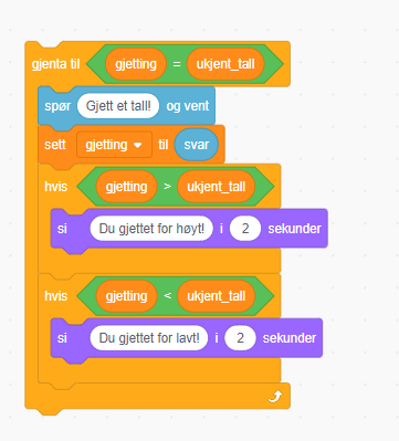 Steg 5 og 6 må gjentas helt til gjettingen er lik det ukjente tallet, så vi legger en løkke rundt koden fra steg 5 og 6.