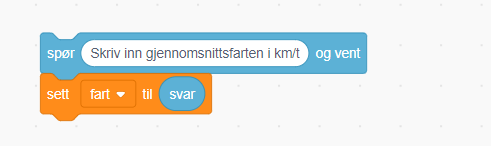 Når figuren klikkes, skal den fortelle hva den skal gjøre, og deretter spørre etter gjennomsnittsfarten. Svaret plasseres i variabelen som hører til.