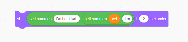 Lag deretter en tekstblokk som presenterer svaret for brukeren. Her er et eksempel hvor jeg bruker to «sett sammen» blokker til å presentere med benevning.