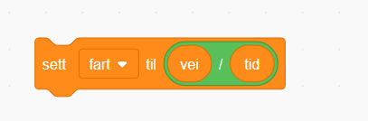 Vi har tre ulike verdier i alle beregningene våre. Enten som input eller resultat. Vi lager derfor tre variabler til bruk i programmet: vei, fart og tid. Husk at de skal brukes på alle objektene.