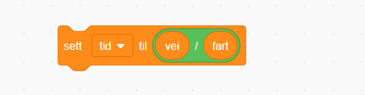 Da har programmet fått nødvendig informasjon for å foreta beregningen. Formelen for å regne ut vei/strekning er fart*tid, som ligger i variablene. Dermed kan vi foreta utregningen, og sette svaret inn i variablene for vei.