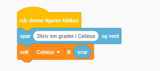 Når du trykker på knappen som er merket med Celsius, så skal programmet spørre etter temperaturen i Celsius. Svaret legges inn i variabelen med samme navn før vi begynner å regne om.