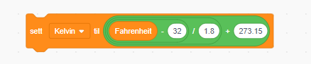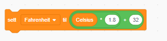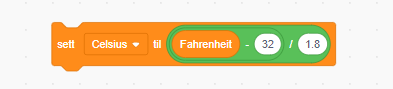 Å regne ut Fahrenheit er noe vanskeligere, og en kan gjøre det på flere måter. Her har jeg valgt å gange temperaturen i Celsius med 1.8 og deretter legge til 32 for å finne rett svar. Siden det er flere regneoperasjoner, må vi være nøye når vi henter inn operatorene.
