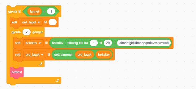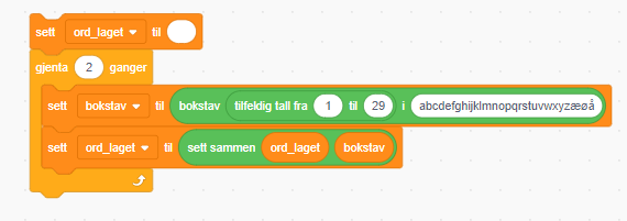 Deretter skal vi hente ut tilfeldige bokstaver fra alfabetet til ordene våre. Vi setter først variabelen «bokstav» med en tilfeldig bokstav fra alfabetet. Vi bruker her blokken «bokstav» og et tilfeldig tall mellom 1 og 29 (vi har 29 bokstaver i alfabetet) fra en tekstbit som er selve alfabetet. Til slutt setter vi bokstaven inn i variabelen «ord_laget».