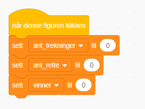 Det første som må gjøres er å nullstille noen variabler som vi trenger for å holde kontroll på trekningen. Vi trenger en som teller opp antall trekninger, en som teller opp antall riktige tall, og tilslutt en som forteller om trekningen har resultert i 7 rette tall.
