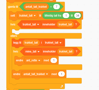 Denne koden kan sikkert gjøres på flere måter, men siden Scratch mangler en blokk som heter «ikke inneholder» ser koden her litt rar ut. Om tallet som trekkes finnes i listen over tall vi har trukket, så skjer overhodet ingenting. Om det ikke finnes skjer det langt mer. Tallet legges inn i listen over tall som er trukket. I samme løkken kontrollerer vi et og et trukket tall mot listen med lykketall. Finnes tallet i listen, har vi en rett, og registrerer dette. Om ikke, går vi bare videre og trekker et nytt tall.