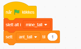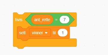 Denne koden kan sikkert gjøres på flere måter, men siden Scratch mangler en blokk som heter «ikke inneholder» ser koden her litt rar ut. Om tallet som trekkes finnes i listen over tall vi har trukket, så skjer overhodet ingenting. Om det ikke finnes skjer det langt mer. Tallet legges inn i listen over tall som er trukket. I samme løkken kontrollerer vi et og et trukket tall mot listen med lykketall. Finnes tallet i listen, har vi en rett, og registrerer dette. Om ikke, går vi bare videre og trekker et nytt tall.
