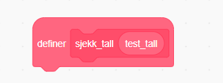 Vi lager en ny funksjon under Mine klosser, som vi kaller sjekk_tall, og som har et parameter med seg inn. Da får vi en ny blokk som heter sjekk_tall, som kaller funksjonen sjekk_tall og som skal ligge i løkken vi laget i steg 2. Den må ligge før den skal legges inn i listen. I tillegg får vi en blokk som skal definere den nye funksjonen.
