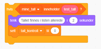 Den andre er kontrollen, er om tallet allerede ligger i listen. Ligger tallet der, setter vi variabelen tall_kontroll til 0, og prosessen med å spørre et nytt tall, vil kjøres om igjen.