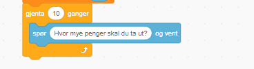Som vi voksne kjenner til, så går det oftere penger ut av konto enn det kommer penger inn. Så også i dette programmet. Vi skal foreta så mye som 10 uttak, og lager en løkke som skal kjøres 10 ganger.